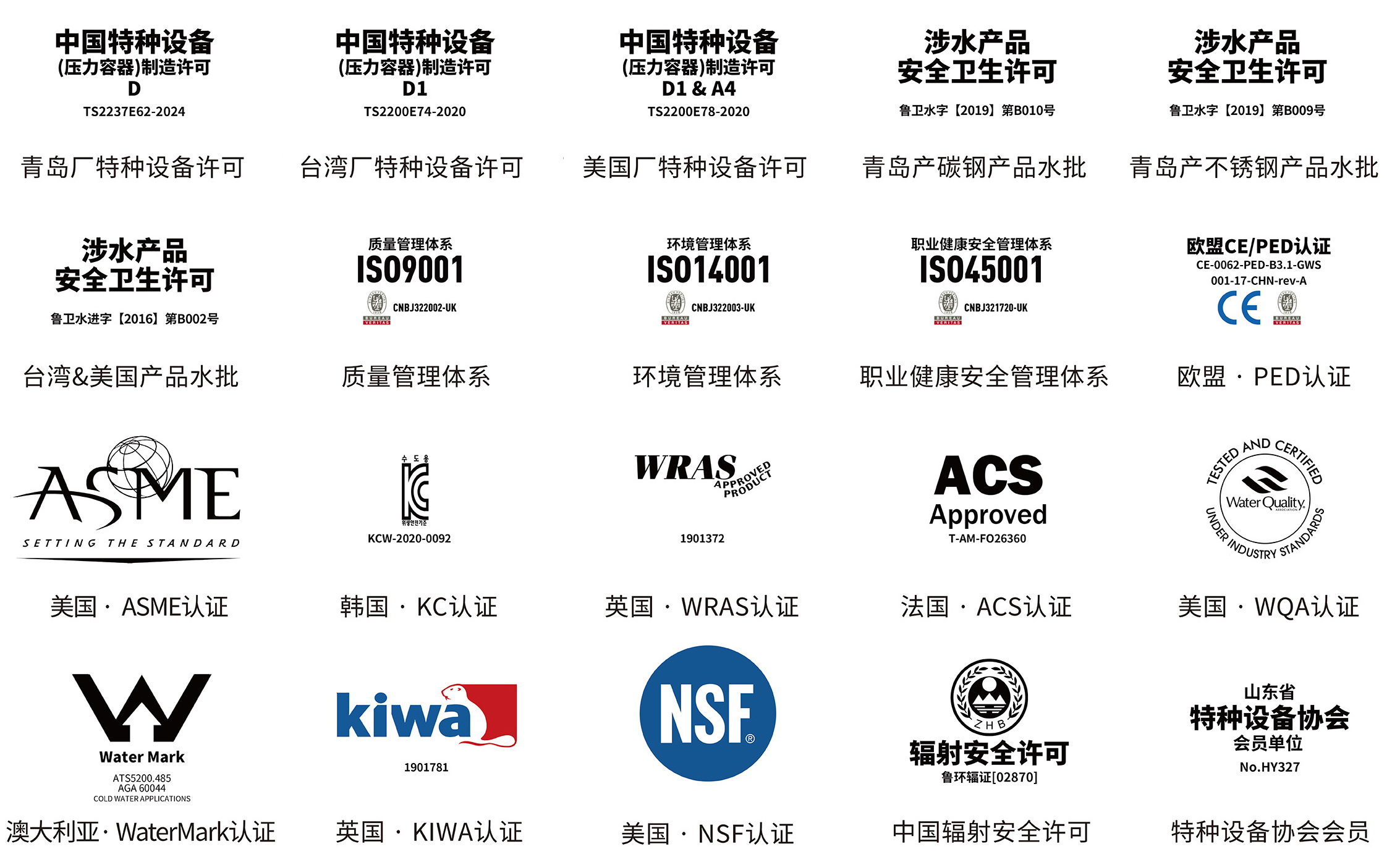 GWS始终位于世界标准领域前沿,并获得诸如中国特种设备(压力容器)D类制造许可和中国涉水卫生安全许可批件、ISO9001、ISO14001、ISO45001以及NSF、WQA、WRAS、CE、PED、ACS、 KC、KIWA、WaterMark等国内外权威认证和专项认证。